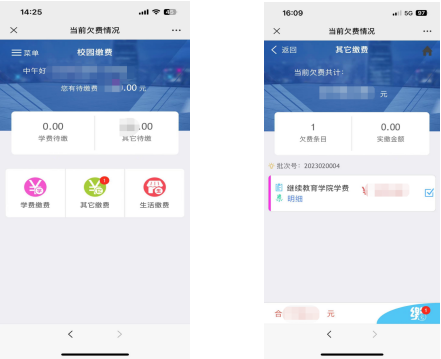 3、登录后出现校园缴费界面,提示待缴款金额,点击有提示的“其他缴费”项目,进入其他缴费界面,显示当前欠费金额,可查看具体批次号和费用明细。